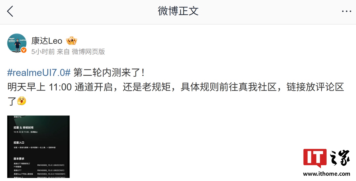IT之家 10 月 22 日消息利鸿网,realme UI 产品经理 @康达Leo 今日宣布:realme UI 7.0 第二轮内测用户招募开启,明天早上 11:00 通道开启。