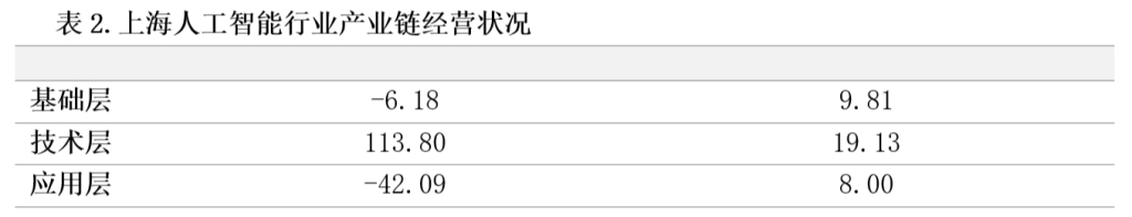 然而,当前AI应用企业经营状况逊于技术层和基础层企业(参考表2)。2024年上海人工智能技术层公司平均利润增长率为113.80%,而基础层公司下降6.18%,应用层公司下降42.09%。2025年第一季度上海人工智能技术层公司平均营收增长率相比去年同期增加19.13%,高于基础层的9.81%和应用层的8.00%。